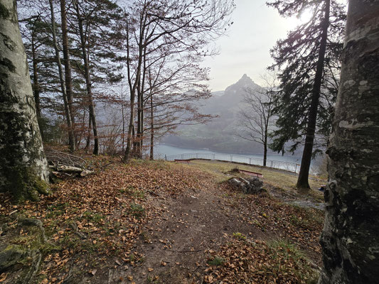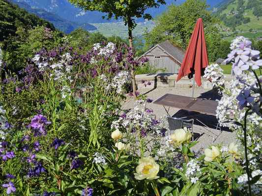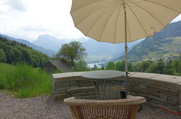 Auf der anderen Seite des 750 m2 grossen Grundstücks liegt ein kleineres, romantisches Kiesplätzchen mit einem wunderschönen Blick auf den Walensee (rechtes Bild).