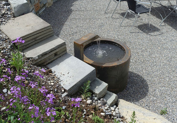 Der Brunnen bezieht sein Wasser aus dem Wassertank unterhalb des Häuschens (Fassungsvermögen 3'000 Liter). Gespiesen wird das Reservoir durch Regenwasser vom Dach und ist somit kein Trinkwasser.